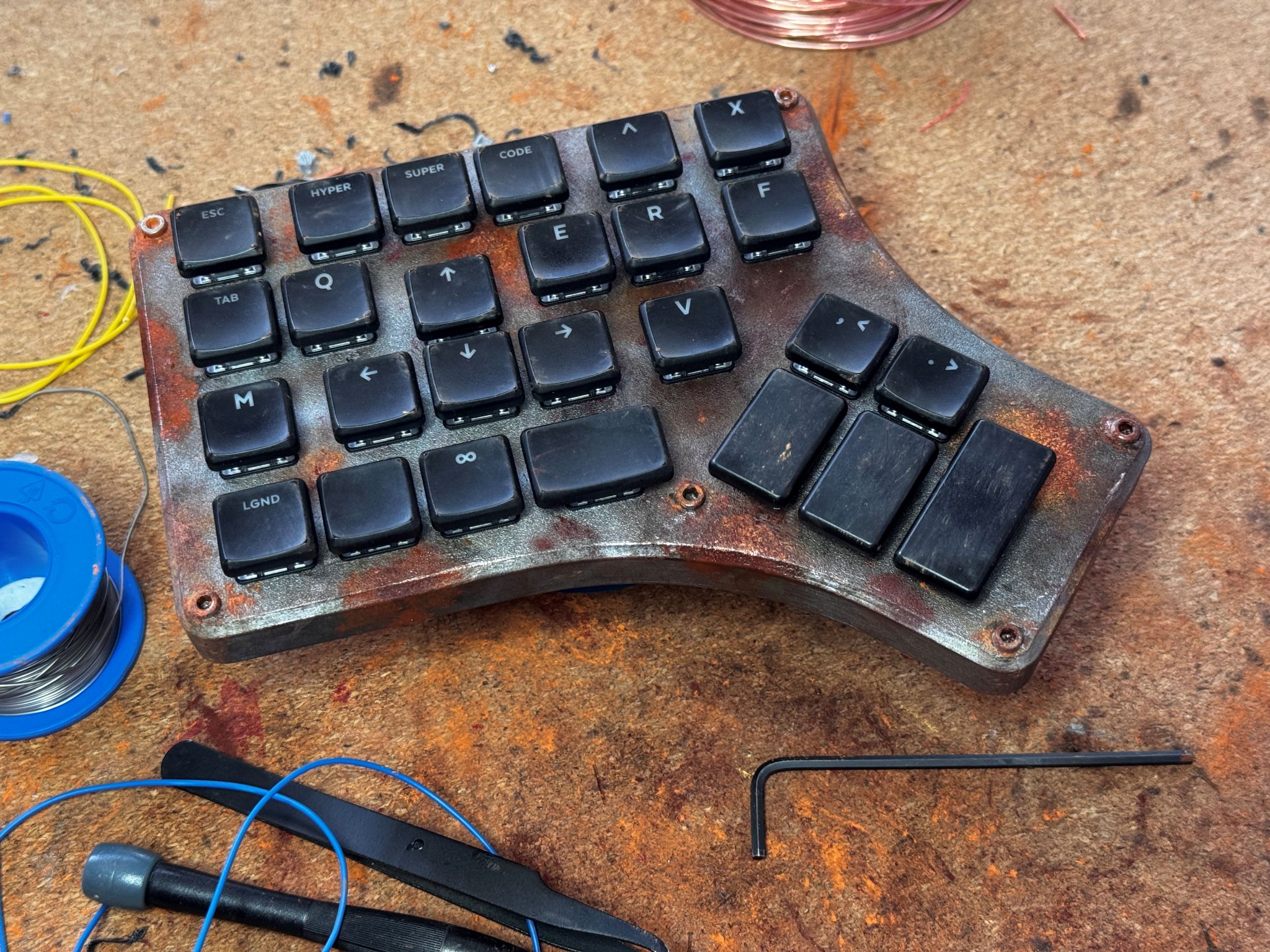 A build guide for the Arc Surfer — a one-handed mechanical gaming keyboard with a grungy, post-apocalyptic paint job inspired by the video game Arc Raiders.